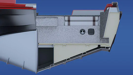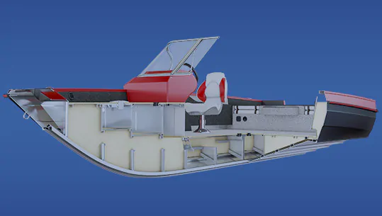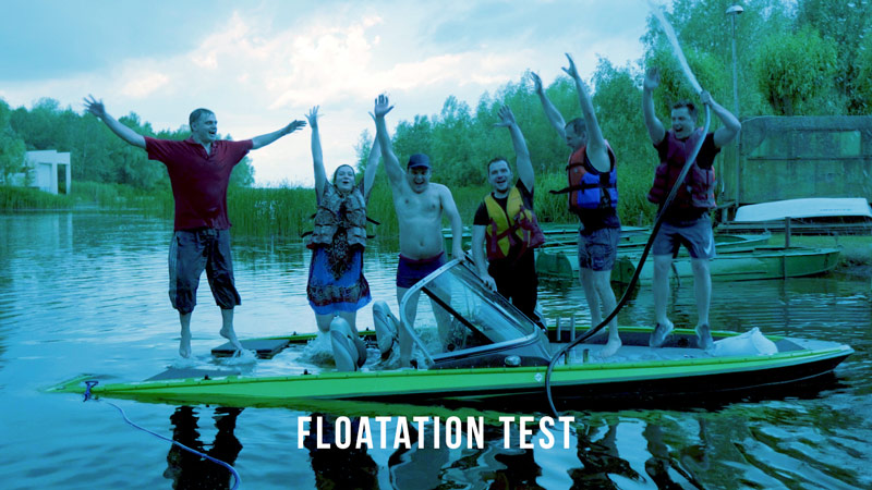 Die Sicherheit und die Schwimmfägigkeit der Finval-Boote wird durch die Befüllung aller Rümpfe mit hochwertigem Zweikomponenten-Schaumstoff gewährleistet. Es hilft, die Wasseraufnahme zu verhindern, die bei einem Betrieb in einer feuchten Umgebung von großer Bedeutung ist. Um sicherzustellen, dass das Boot im halb getauchten Zustand seine Stabilität nicht verliert, werden die Auftriebsblöcke so nah wie möglich an der Hülle platziert, um die Möglichkeit einer negativen Beeinflussung sowohl am Heck als auch am Bug auszuschließen.